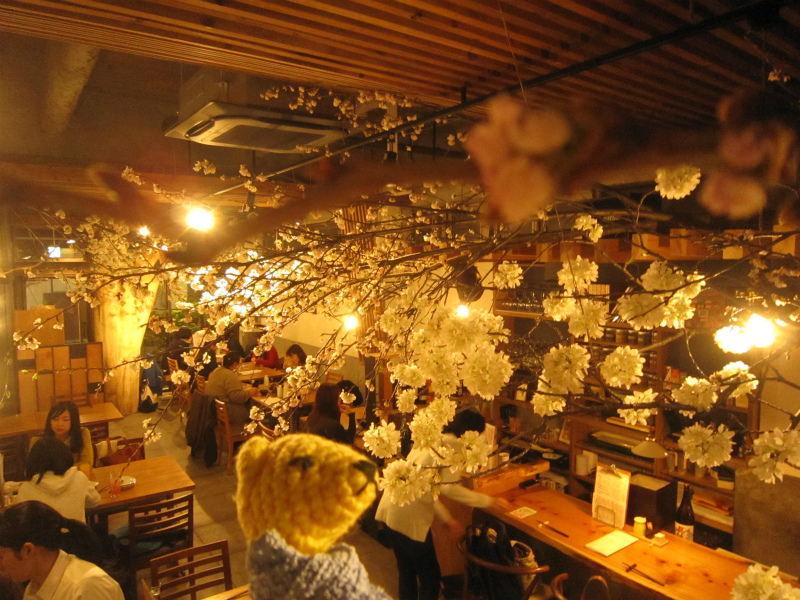 小田原森メシに入ると、天井中が満開の桜!本物の枝ぶりで素晴らしくいい風情。