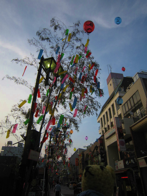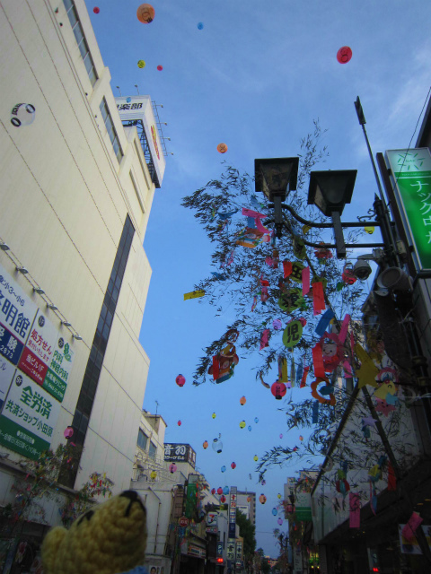 お堀端商店街は七夕飾りと提灯のバルーンアートでなかなか華やか。