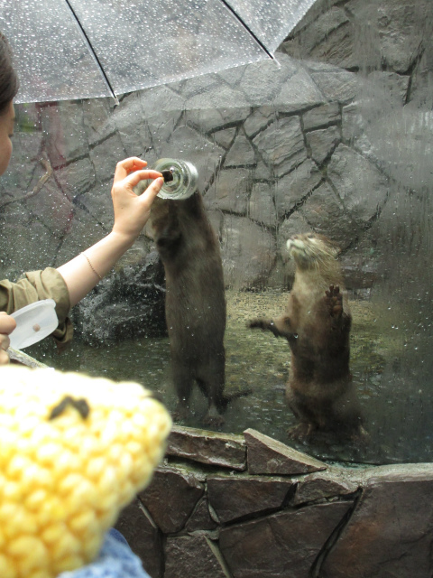 いよいよカワウソと触れ合いタイム!小穴からごはんをあげると小さい手でつかんでかわいい!