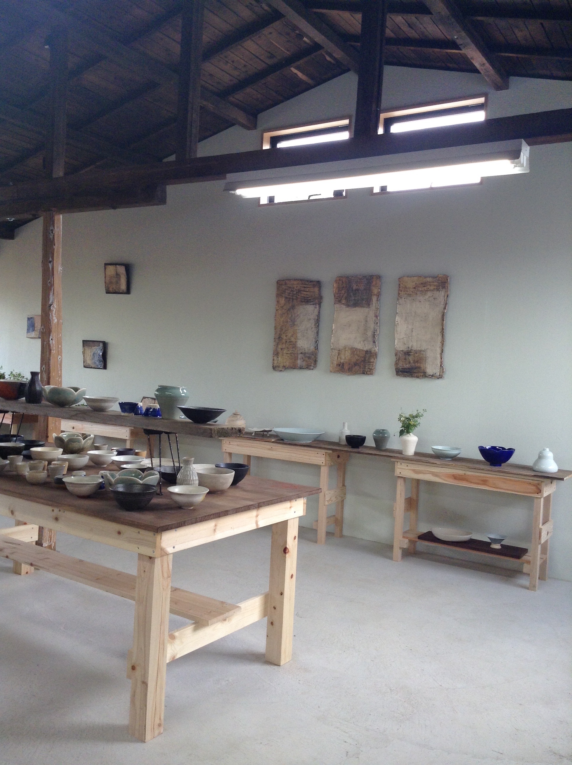 5月1日に新工房がオープンした岡村工房へ。広々とした空間に工房一家4人の作品がずらり。