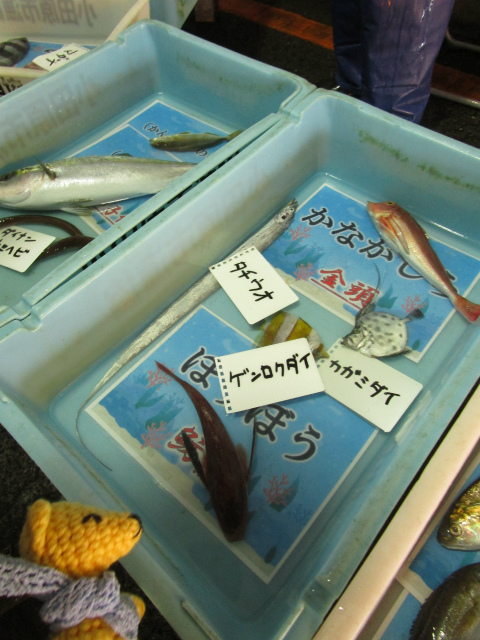 かます棒、揚げ蒲鉾、鯖の竜田揚げ、つぶ貝などを堪能。お魚名前当てクイズではボールペンもGET!