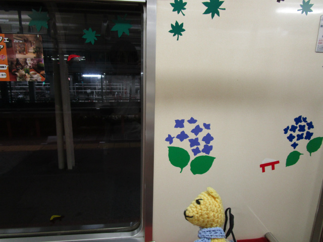 黄色い大雄山線に乗りこんだら、車内の壁やドアや窓に切り絵がいっぱい。