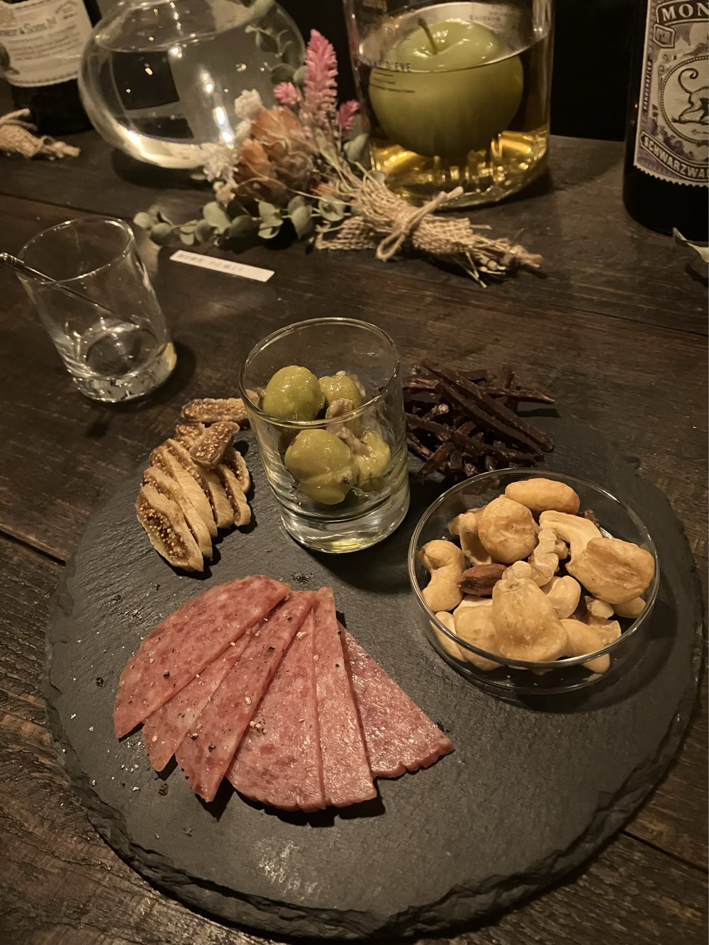 雨の夜、贅沢に貸切で堪能したあと、おつまみとお酒が味わえる幸せ。