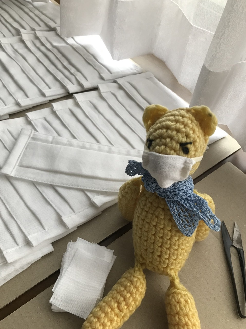 ミシンがでているついでに、たみお専用マスクもつくってみた。
