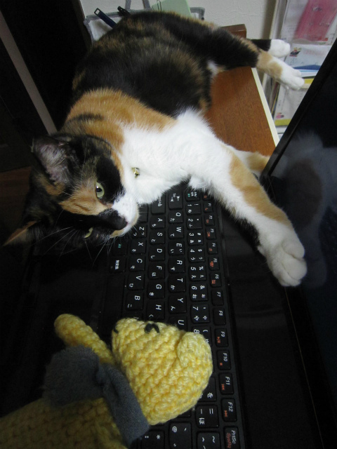 キーボードは枕にちょうどいいのよね、とグニャン。