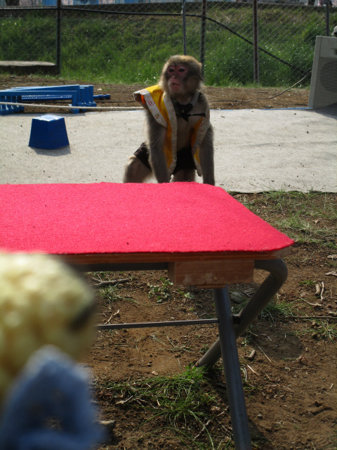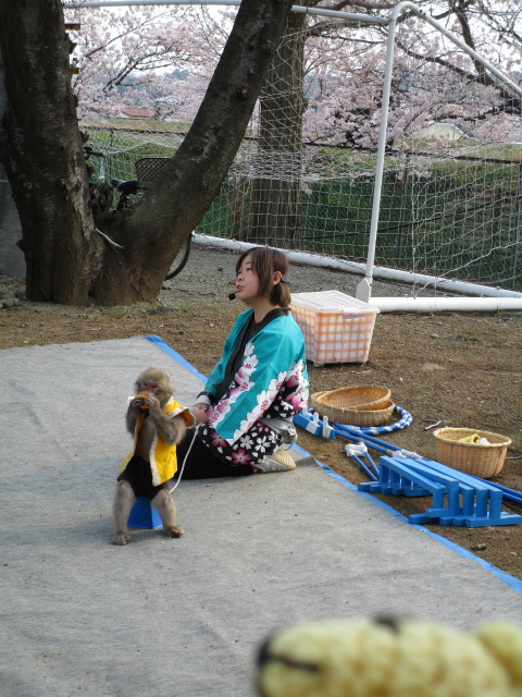 先月瀬戸屋敷で会った猿まわりの「ゆずぽんず」に桜まつりの会場で再会。