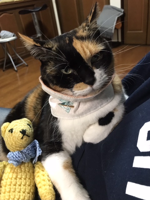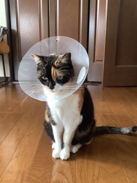 グニャン、顎の下に掻きむしり傷ができてしまいエリザベスカラーデビュー。