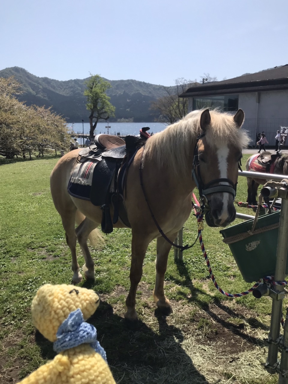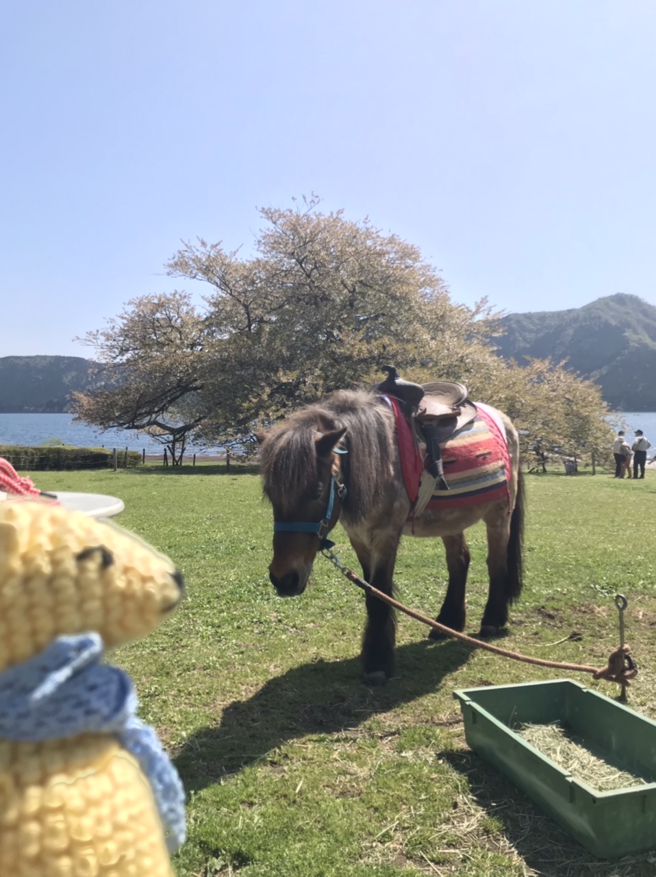 湖畔のポニーにご挨拶。二頭ともとてもおとなしい。