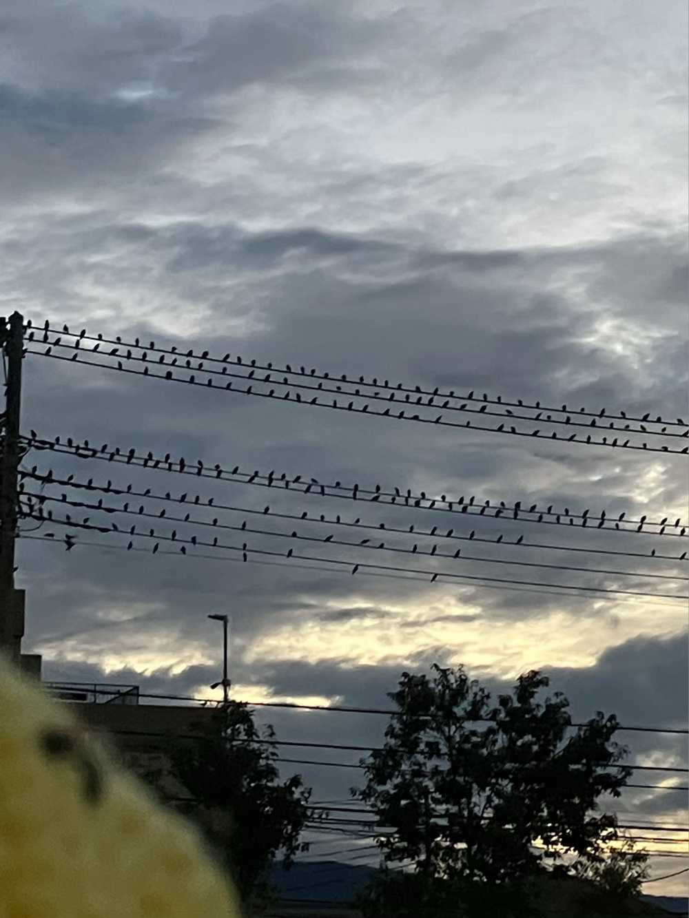 街路樹と電線は超満員で、鳴き声の音量もものすごい!
