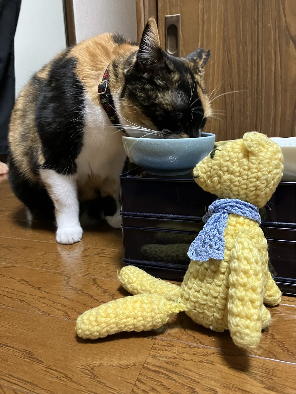 おもむろにカリカリをガツガツ食べ始めたグニャン。この頃「見守っててください」ブーム。