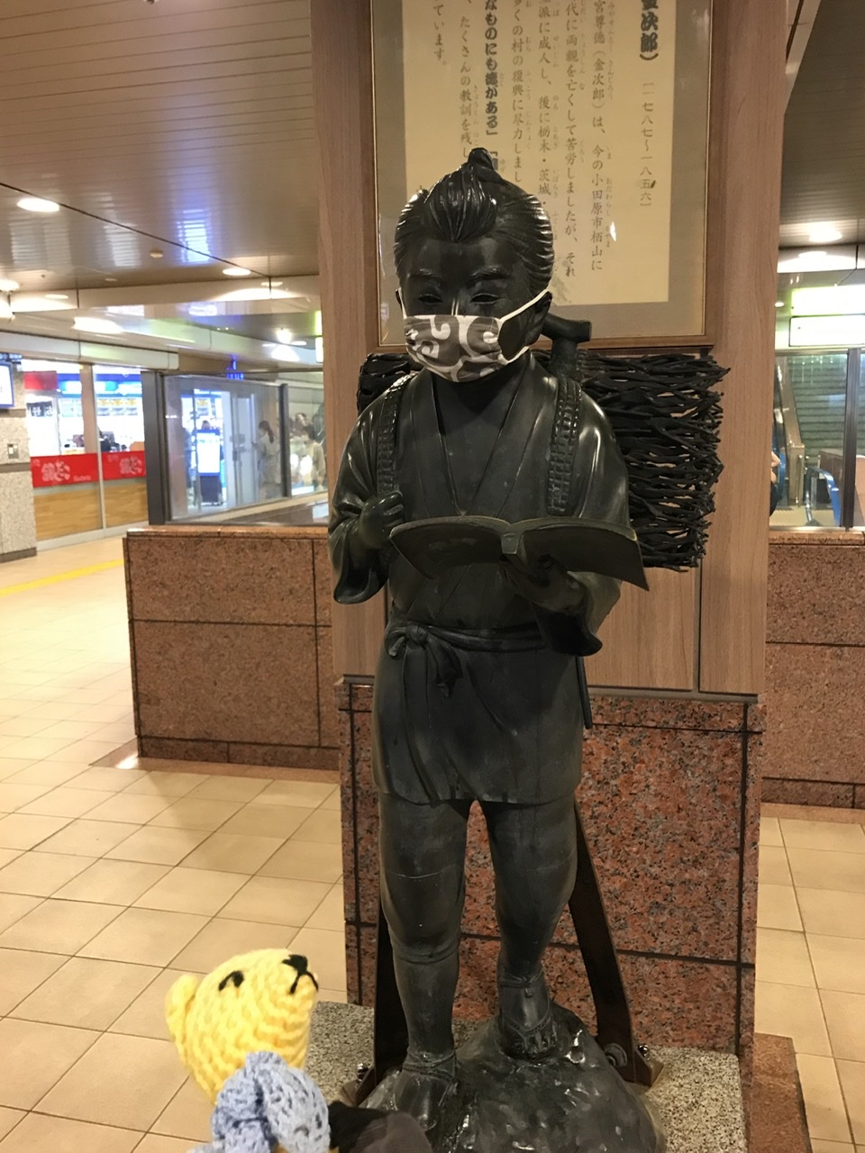 小田原駅の二宮金次郎像さんもやはりマスクをしておられます。