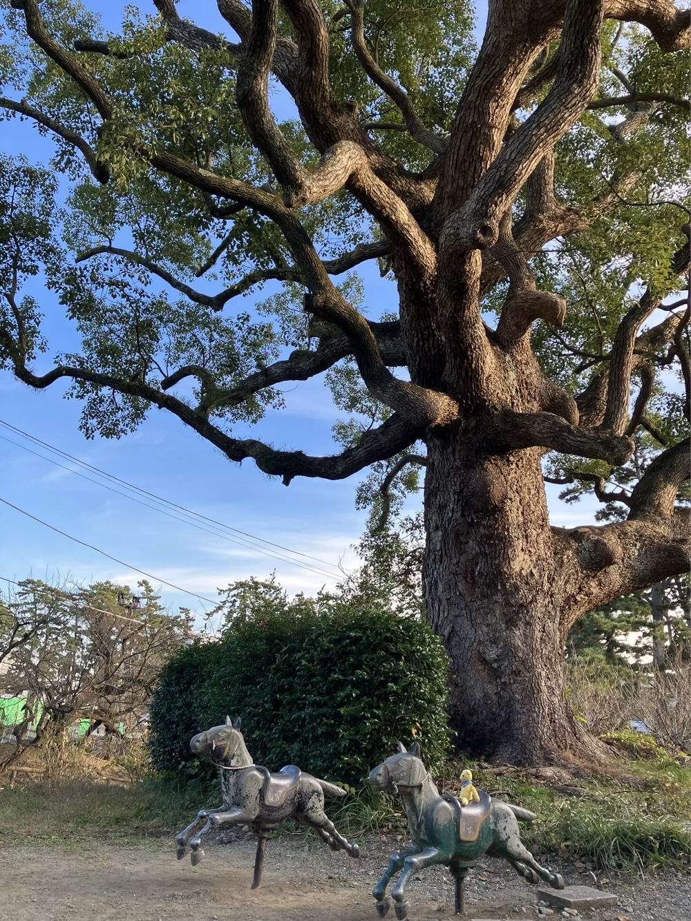 愉快な小田原散歩。大楠の前で乗馬。