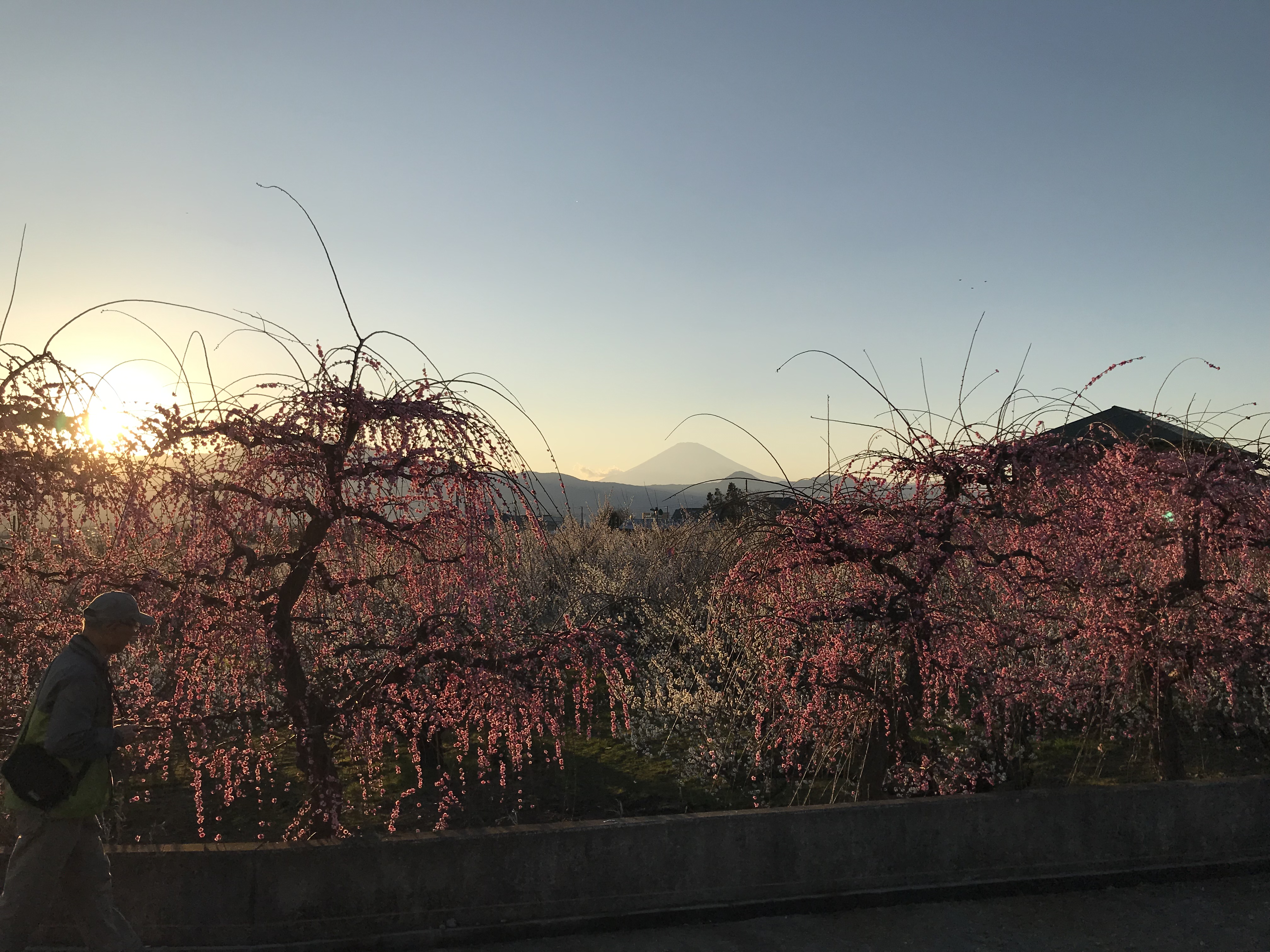 に行くと、ちょうど輝く枝垂れ紅梅と広がる白梅林と富士山の夕暮れ競演。贅沢な景色だemoji