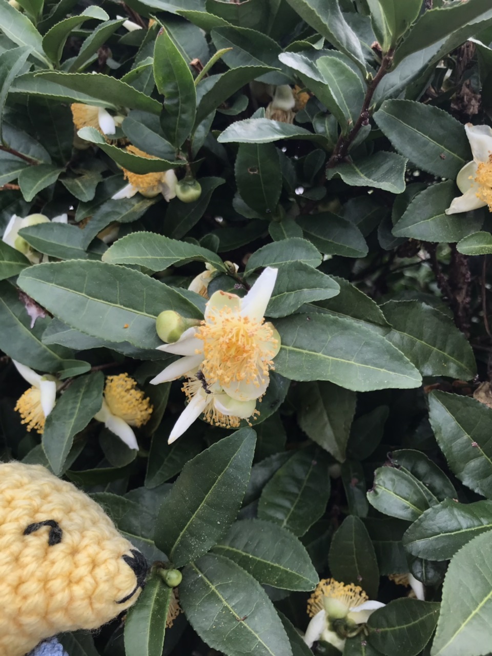 生垣のお茶の花、咲いてるね。