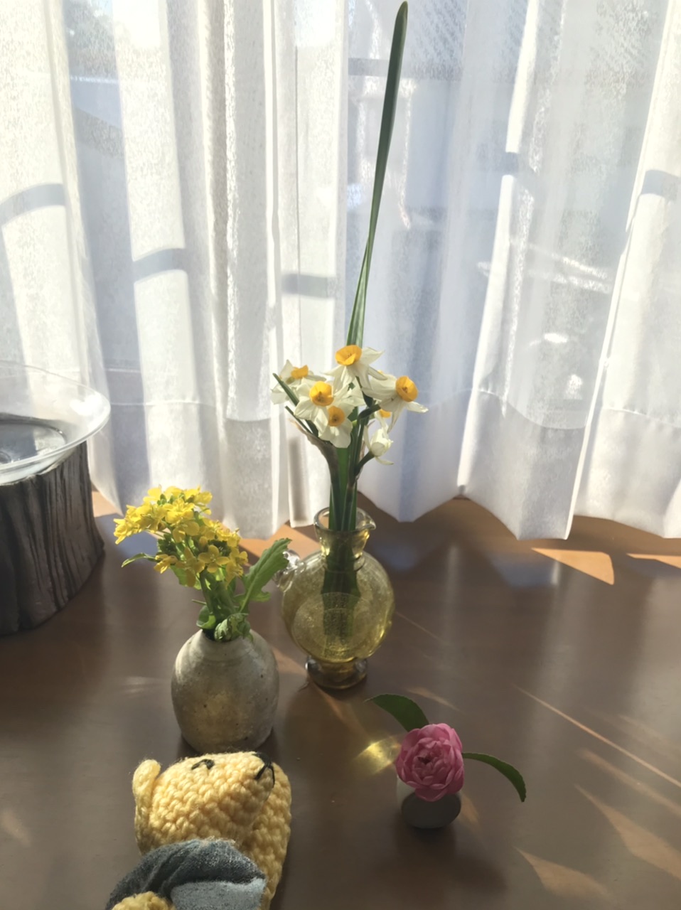 菜花、水仙、山茶花。明るい色あいの花たち。