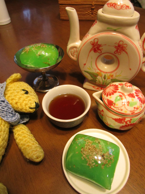 とのこと。こう見えて着色でなく餅米自体の緑色、緑豆餡やココナッツの優しい甘さで美味い!びっくり!