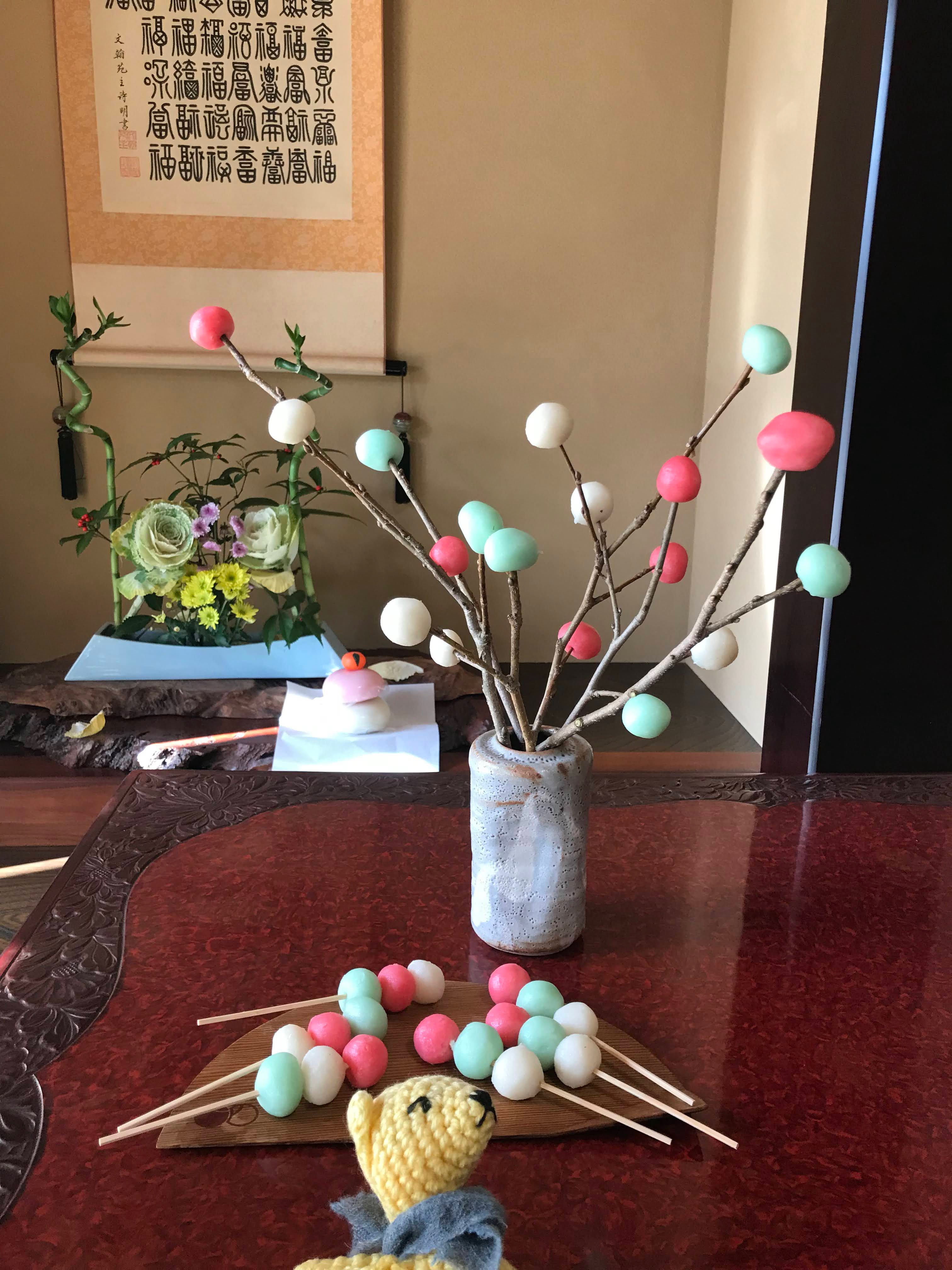 どんど焼きのかわいいお団子。まんまるでカラフルなお団子がついた枝の華やかさ。