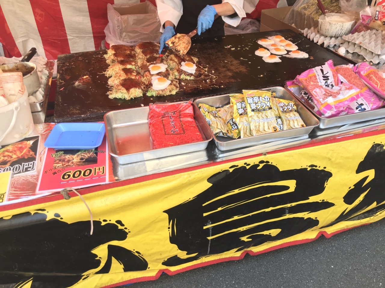 松原神社のお祭りで食べた広島焼きと唐揚げ、美味しかったなあ。