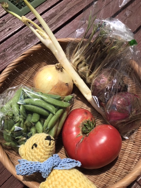 玉ねぎ5キロと変トマト、ウド、スナップエンドウ、矢車草をGET。2000円で沢山お釣りがきた!