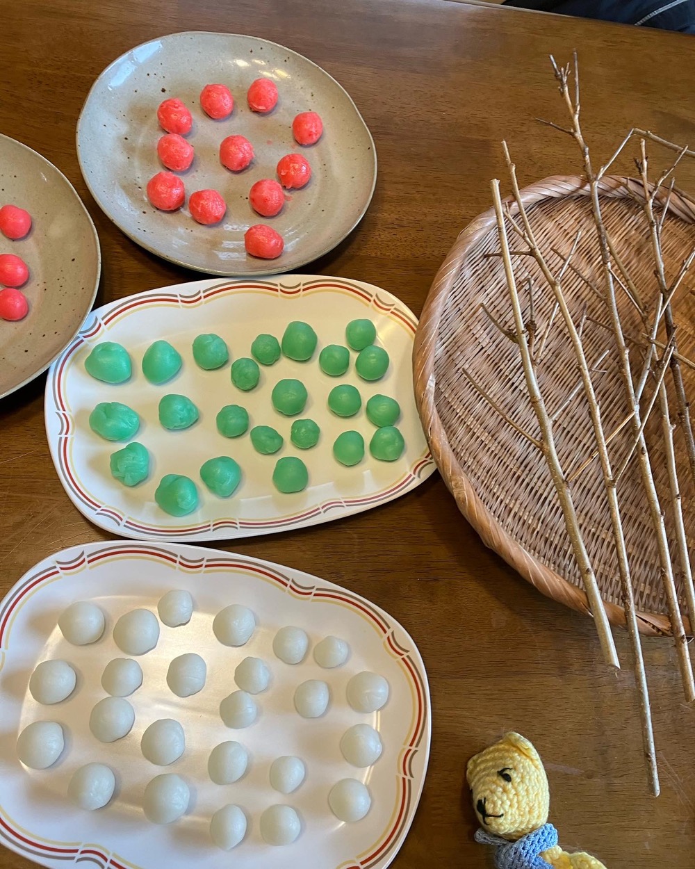 小正月、どんど焼き。赤白緑のかわいいお団子。