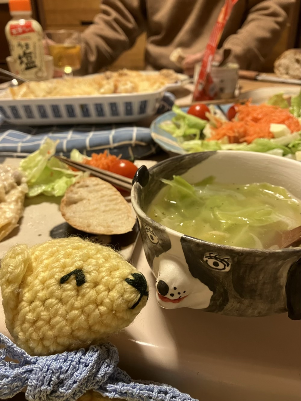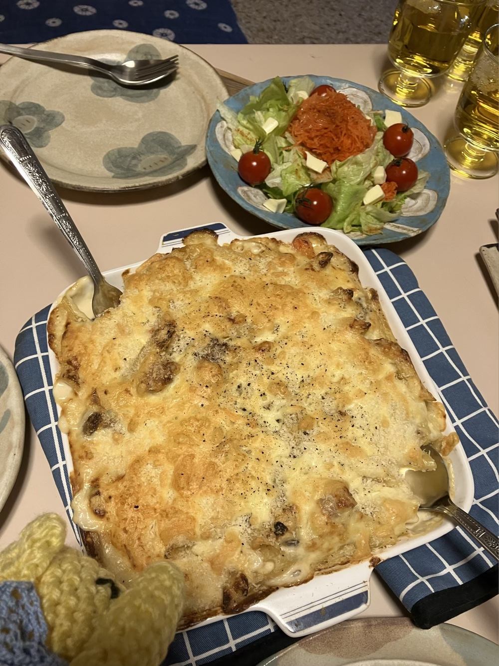 本日のメニューはジャガイモと菜の花炒めとグラタン!サラダ&スープ付。旨旨ご馳走様でした!