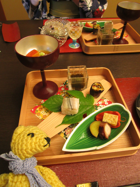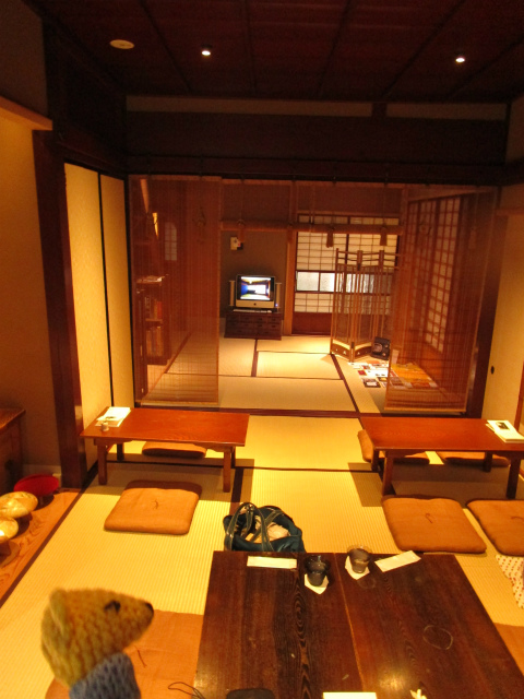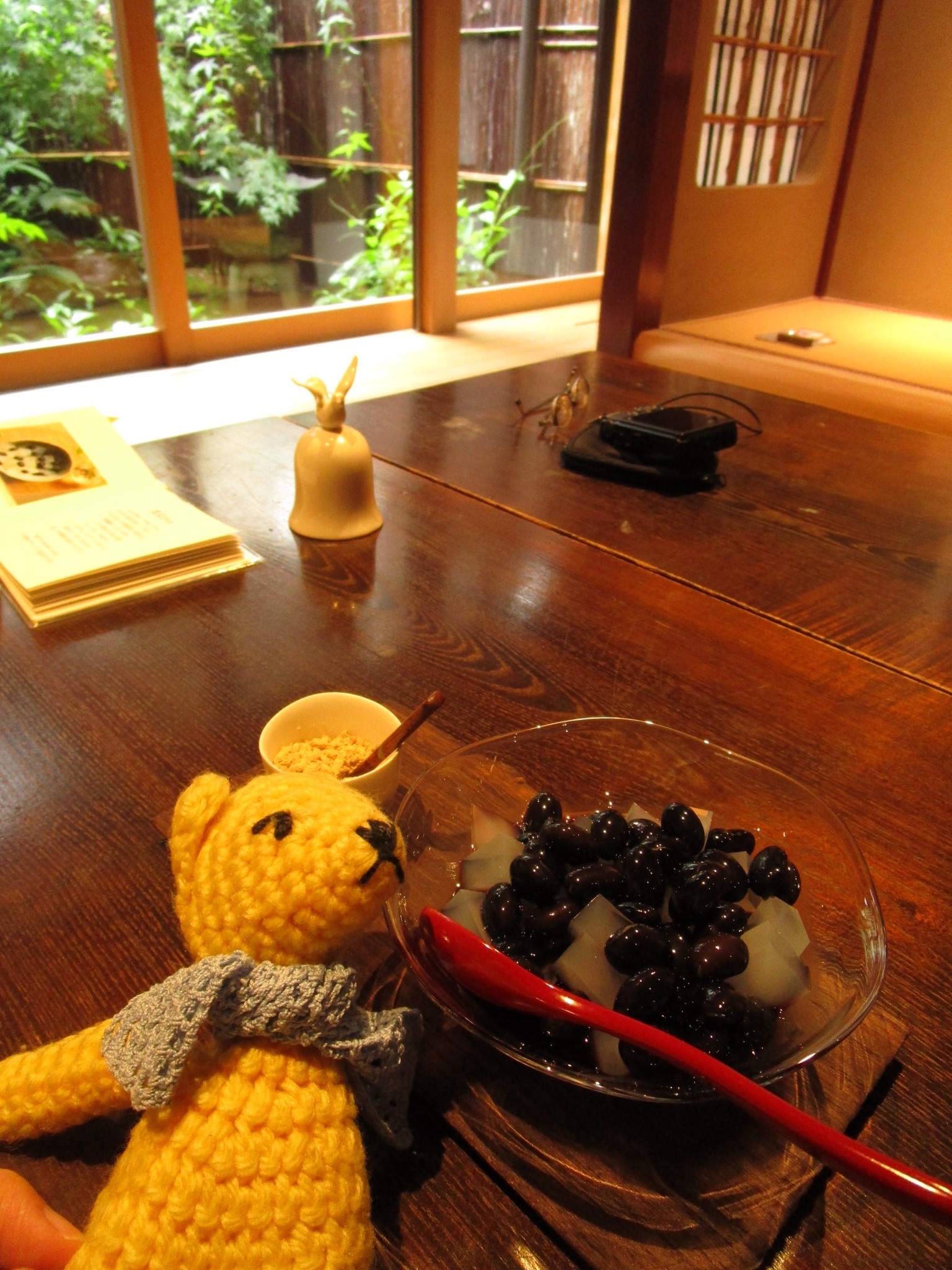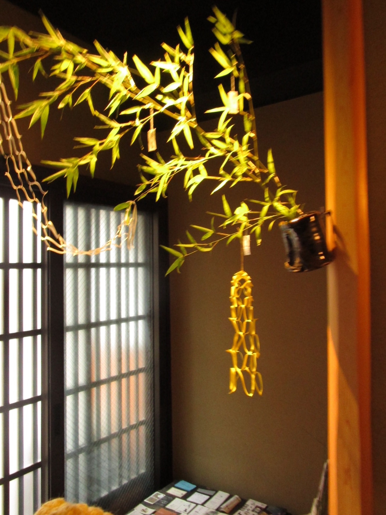 念願の東山の甘味処、豆月で美味しい黒豆かんをいただく。玄関には素敵な七夕飾り。