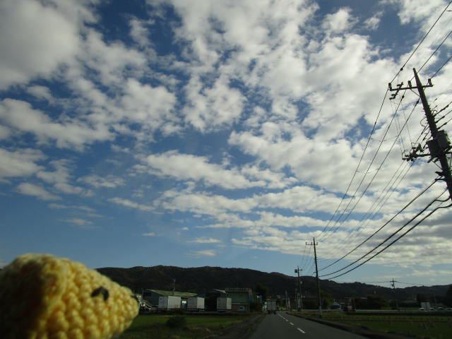 田んぼ、まっすぐな道、向こうに山、そして青空に白い雲。
