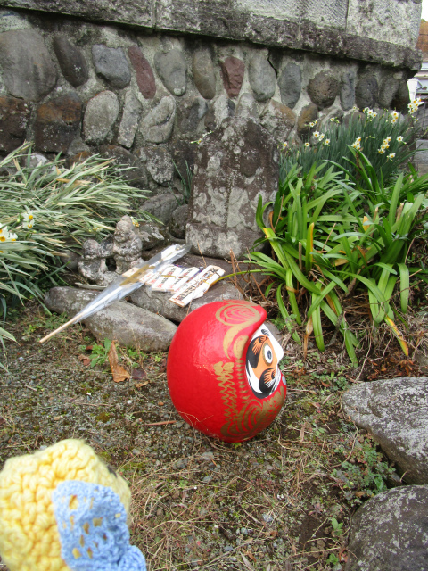 神社の脇の道祖神に置かれた達磨や古い御札や破魔矢など。