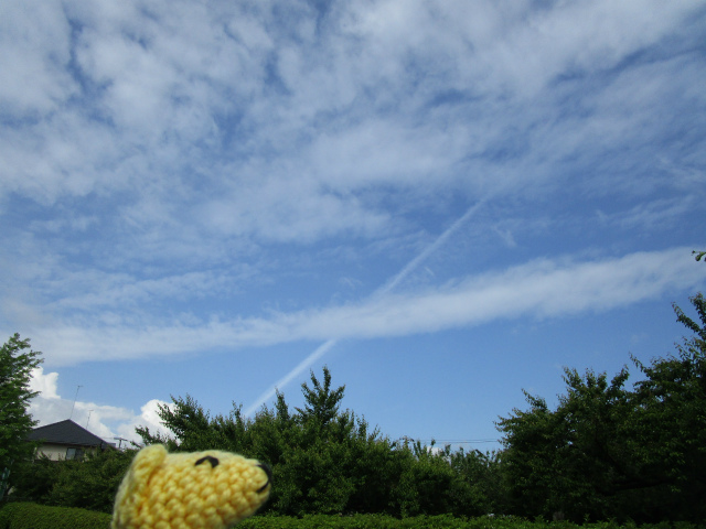 薄い雲を突き抜けるように一筋、飛行機雲。