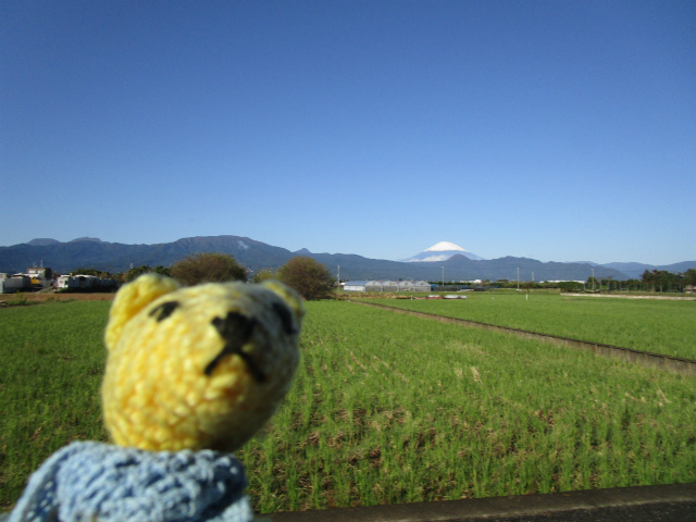 澄み渡った青い空と、きれいに雪化粧された富士山と、稲刈り後の広々した田んぼと。