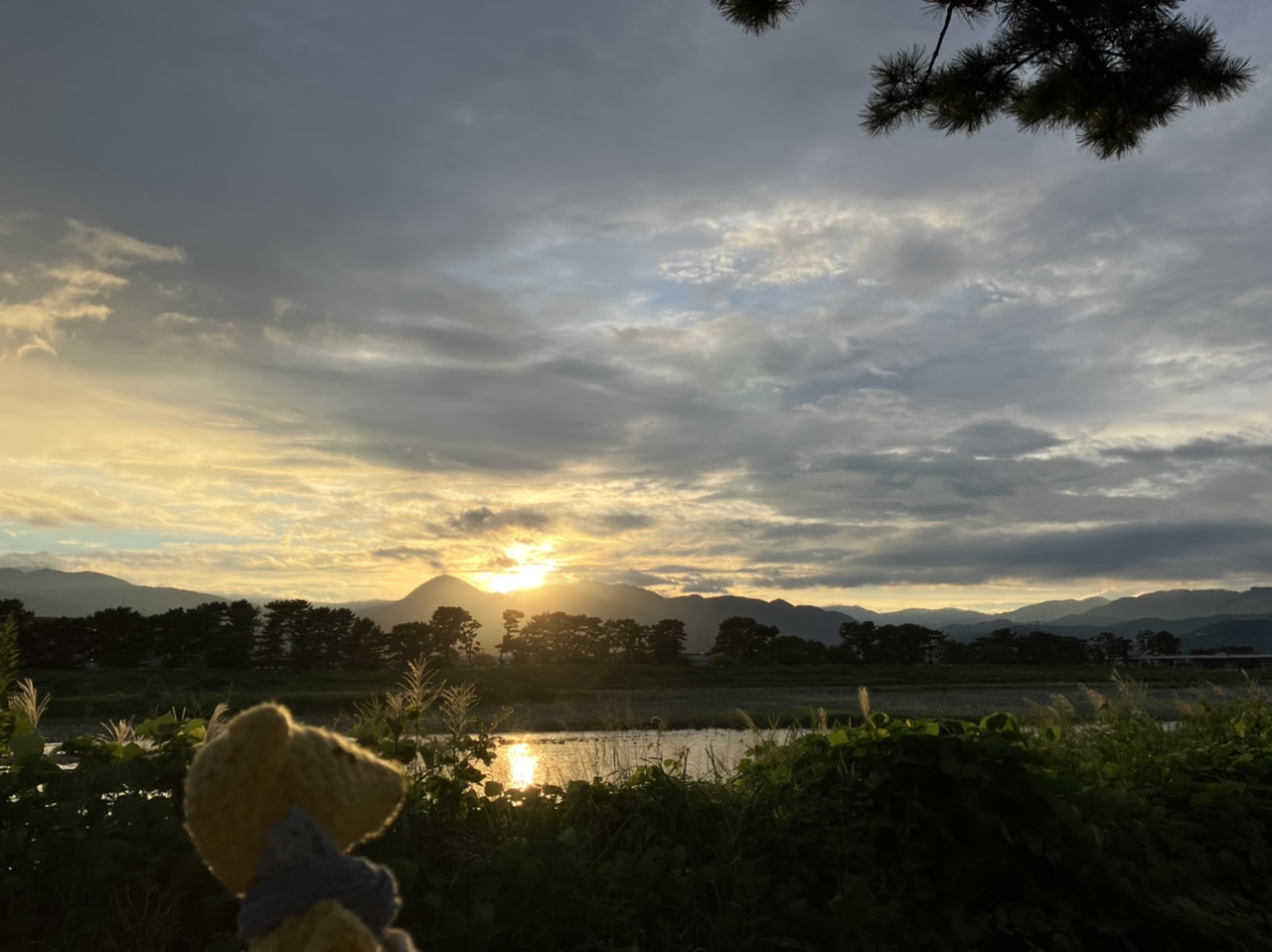 矢倉岳と富士山の間に落ちていく夕日。ススキたなびく河原夕景。いろいろな感情が湧き上がる。