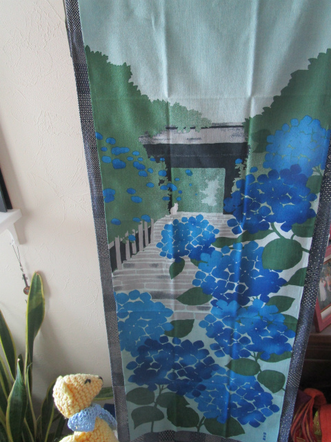 この季節らしい手拭いをみつけたので、早速衣替え。やっぱ紫陽花は絵になるねえ。