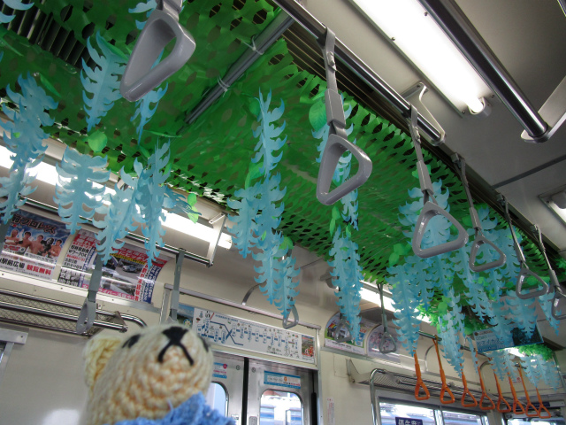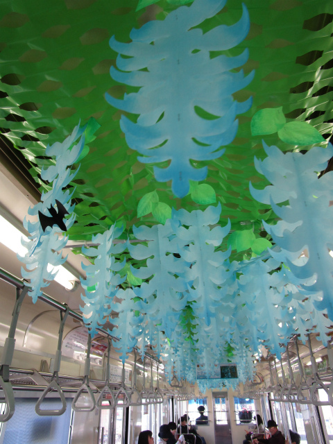 ヒスイカズラの開花に合わせてのコラボ列車。こんな車内なのに、皆さんいたって普通に乗ってます。