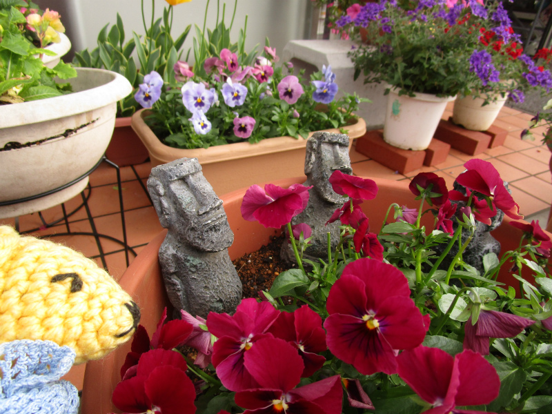 パンジーの鉢のなかにちっちゃいモアイ像。