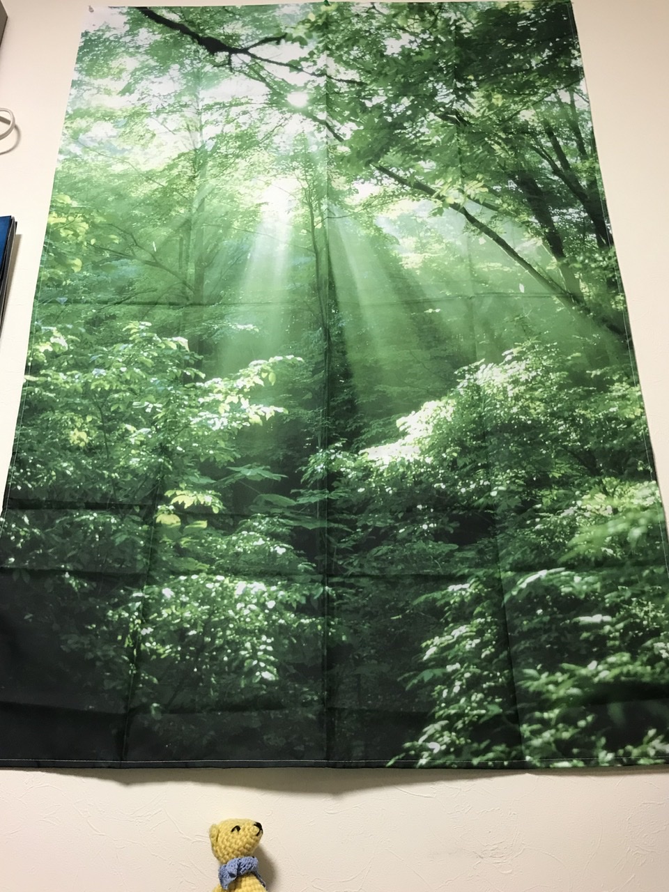 部屋の壁をイメチェン、森の雰囲気のでっかいタペストリーを貼った。