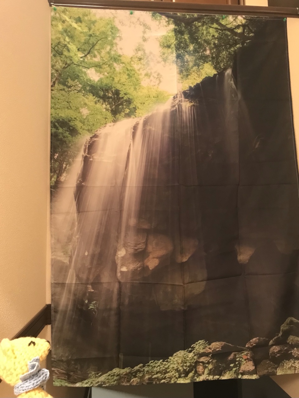 森タペストリーに続いて今年はもう一箇所、階段吹き抜け壁に滝タペストリーを。
