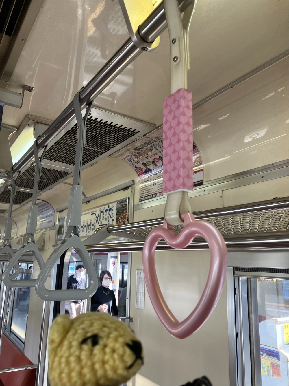 向かいの席にハートの吊り革。