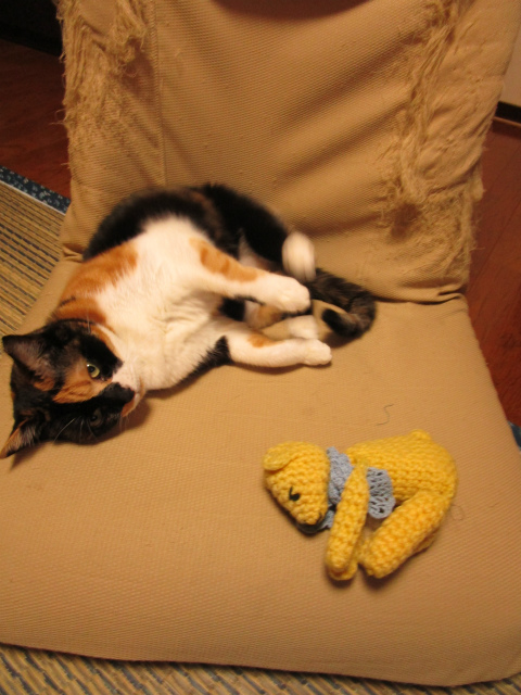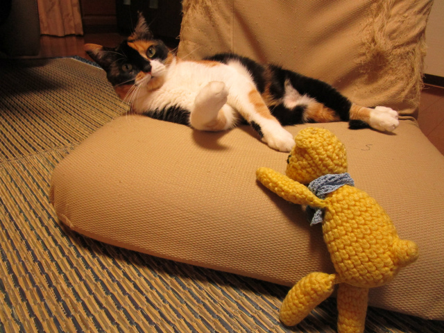 ぐにゃんぐにゃんのグニャンちゃんとフリンジ座椅子で一緒に遊ぶ。