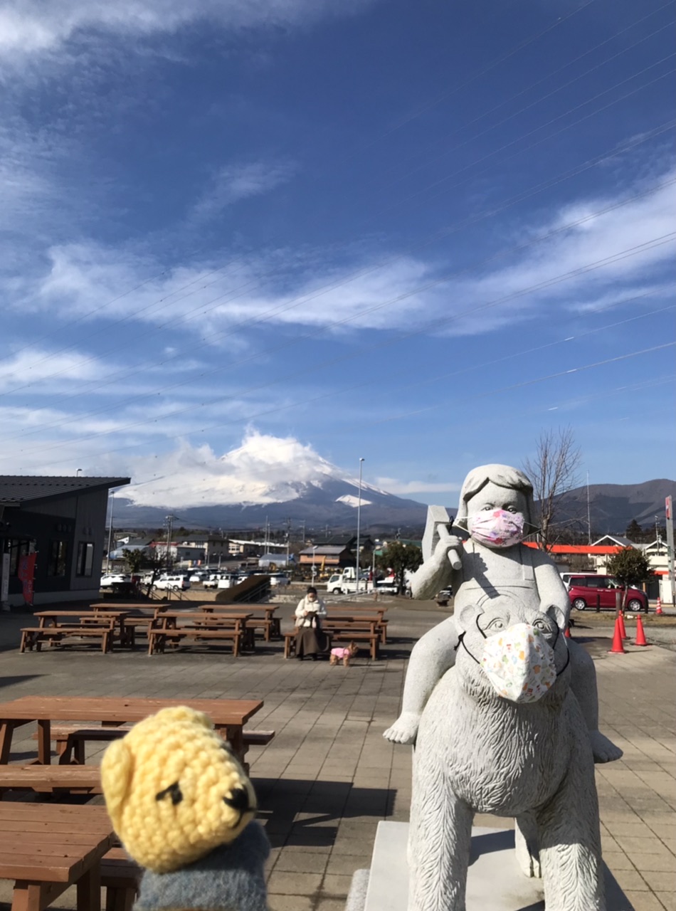 雄大な富士山を背にマスク姿の金太郎。しかも花柄。