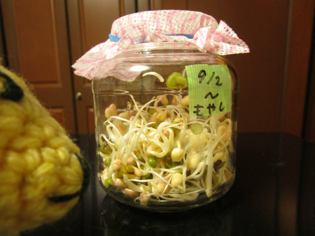 おとといの午後水につけといたもやしの種。たった2日でもうこんなになってる!!