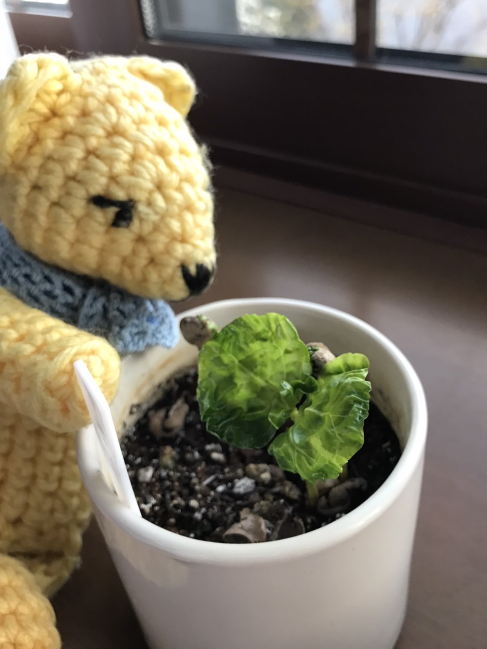 3月に入ってようやく脱皮し双葉が開き出した。芯にはちいちゃい本葉も出てきてる。春なのね。