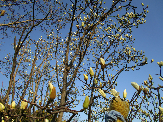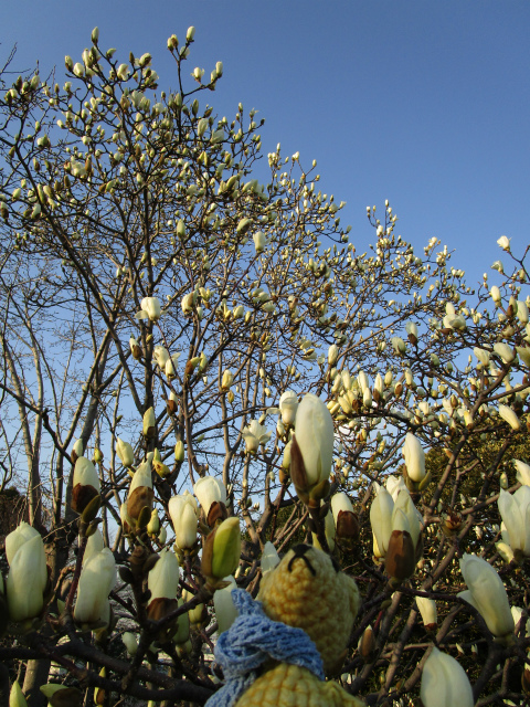空に向かって一斉にひらこうとするハクモクレンの花。一つ一つの蕾がいとおしい。