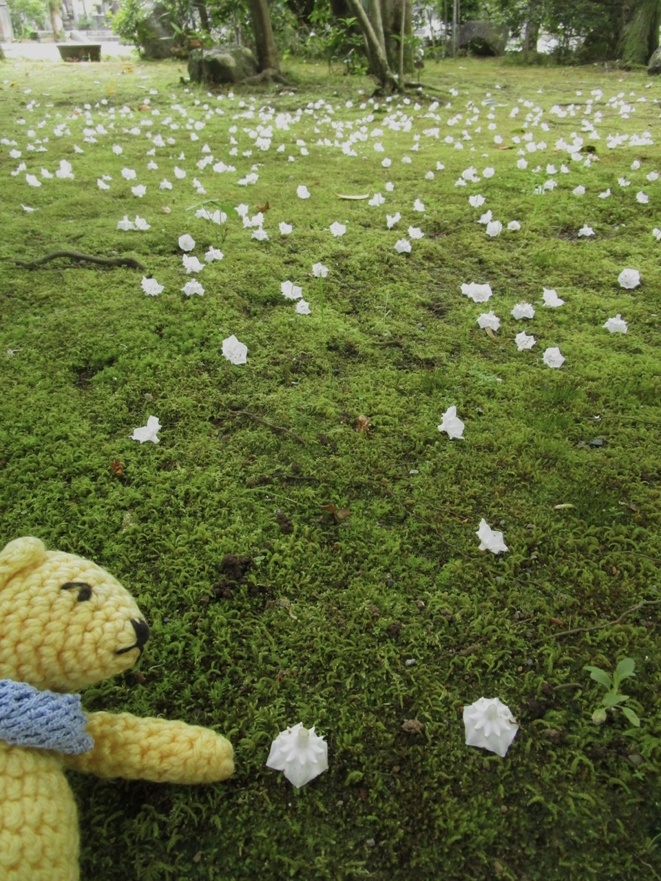 お寺の鐘楼の裏、苔の上に白いなにかがぽとぽとと。