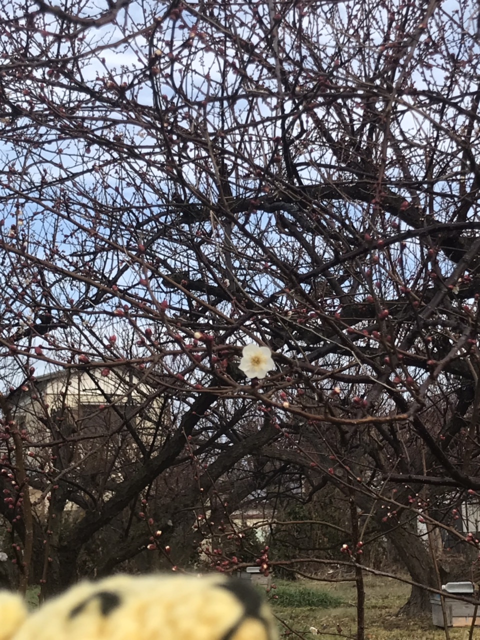 梅の木。このところだいぶつぼみが膨らんできた思ったら、とうとう一輪開花。