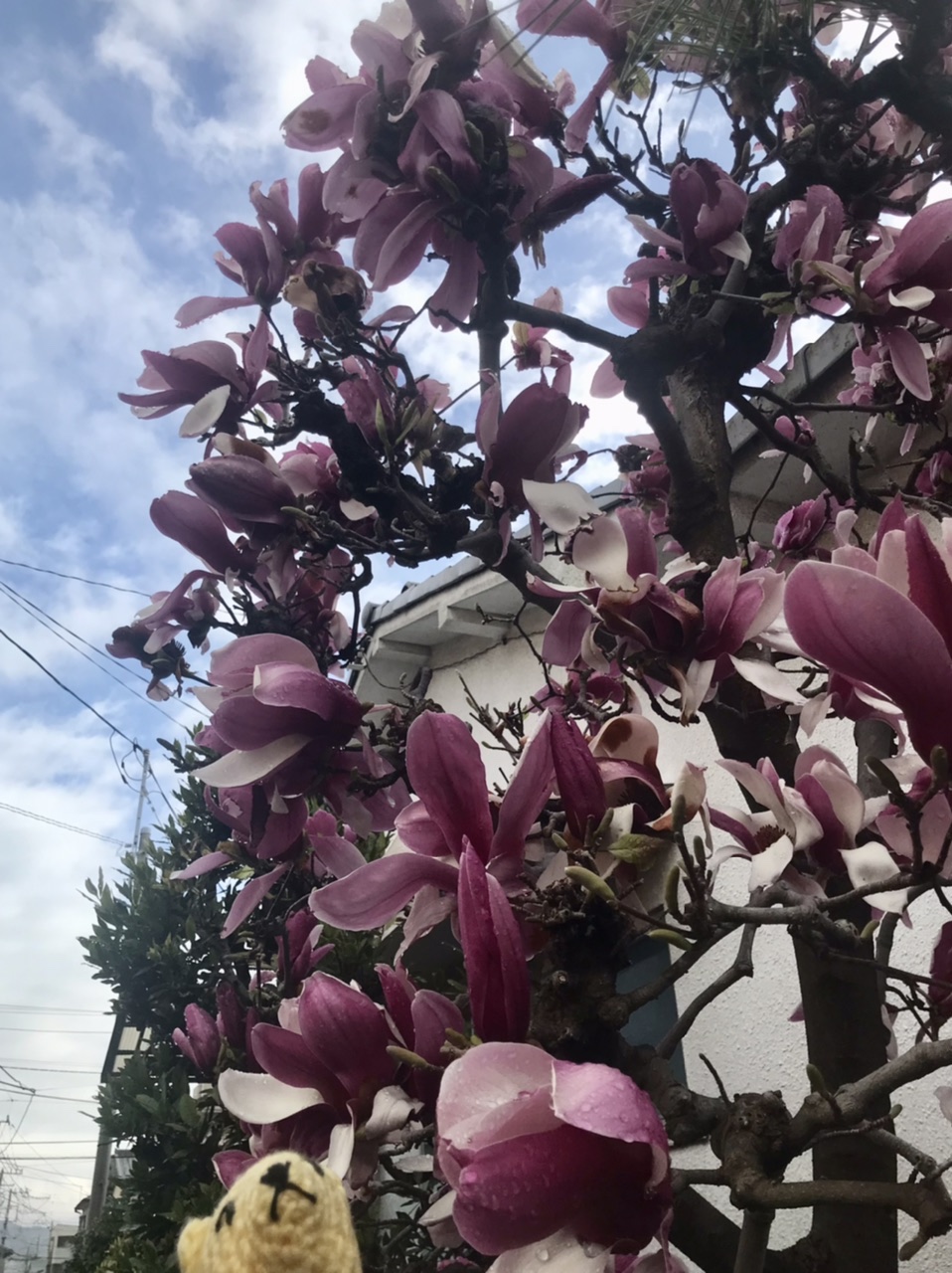 見頃を迎えた木蓮の花。昨夜の雨で朝まだ滴がいっぱい。