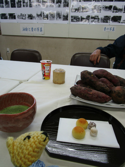 小田原の昔の写真つい見入ってしまう。見終えるとお抹茶とお菓子が!あたたかいおもてなしに感激。