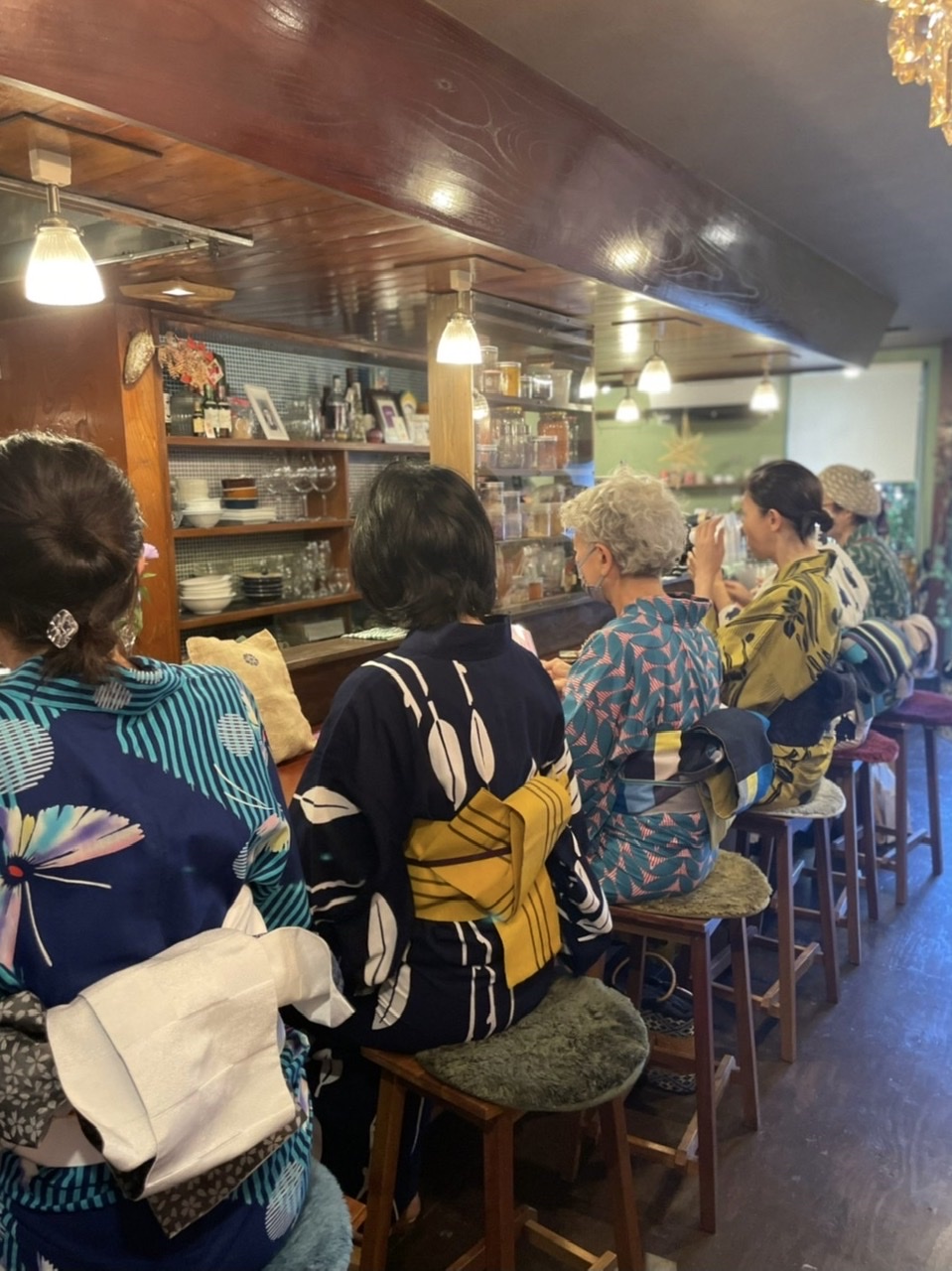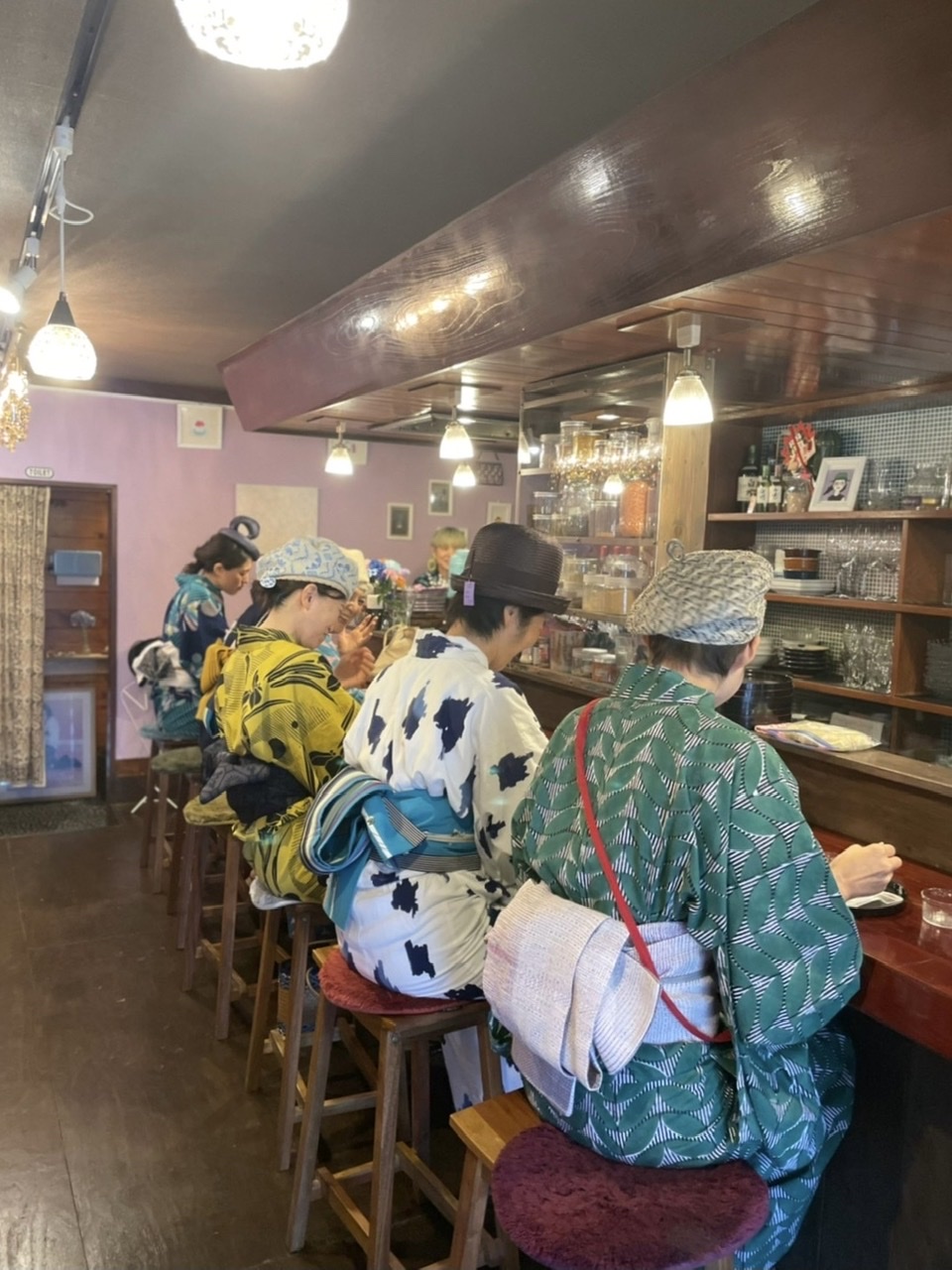 カウンターにずらりと浴衣姿。圧巻。この後カルトハットさんの帽子を被っての撮影タイム!