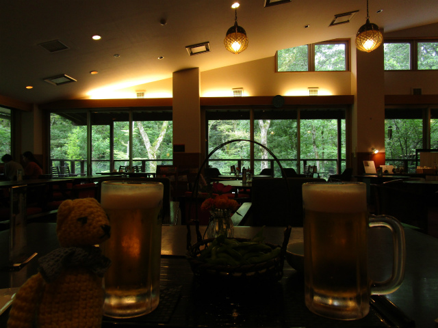 ぬる湯の温泉にゆっくりつかって、この景色のなかでの生ビールは、相当の贅沢気分。