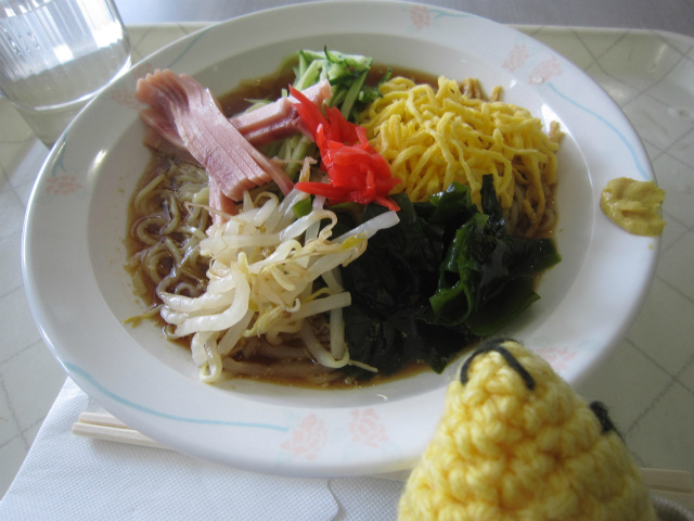 冷やし中華を注文。キュウリ緑、錦糸玉子黄、ハムピンク、もやし白、ワカメ黒、