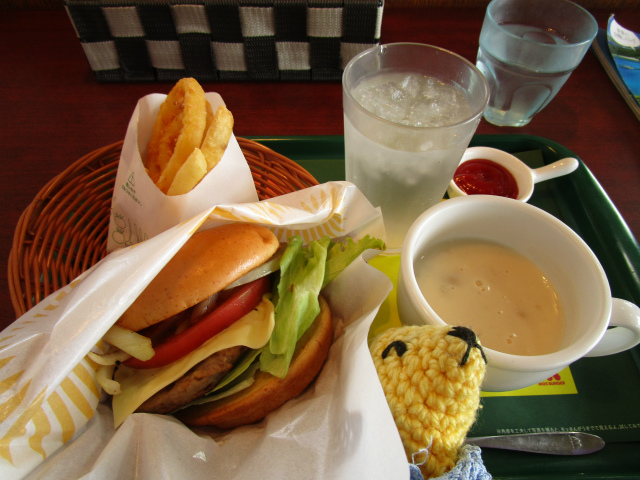 モス金曜日限定の「ごちそうチリバーガー」。やっぱりオニポテとクラムチャウダーつけちゃう。